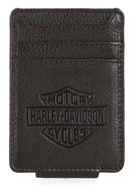 Harley-Davidson® Men's Bar & Shield Leather Money Clip - Brown, MWM063/01. Features an iconic direct heat embossed Bar & Shield logo. Magnetic flap closure. Constructed from high-quality Genuine leather. Size: 2.875" x 4"