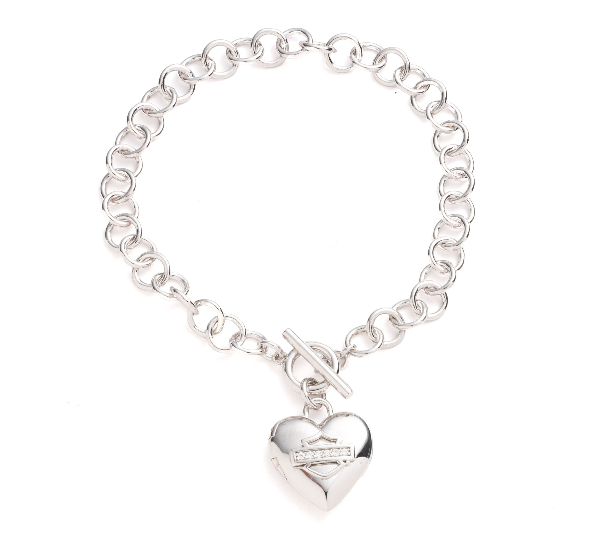 WOMEN'S BOXED STERLING SILVER WITH CUBIC ZIRCONIA PAVE BAR & SHIELD HEART LOCKET CHARM BRACELET
